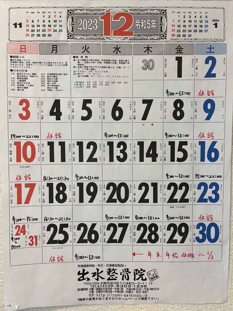 《令和5年12月の施術日、施術時間のお知らせ》